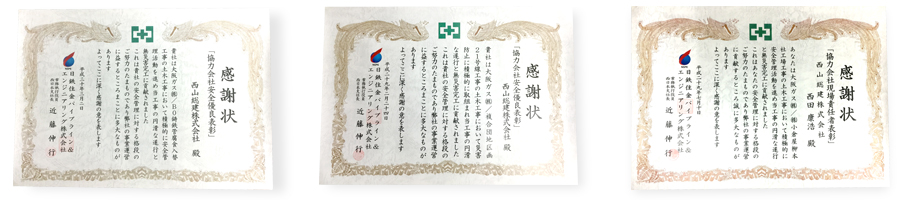また近年では、お取引先である「日鉄住金パイプライン&エンジニアリング」様より、工事における「協力会社安全優良表彰」や「協力会社現場責任者表彰」など、各種表彰をいただいております。これからも西山総建は安心安全を徹底してまいります。